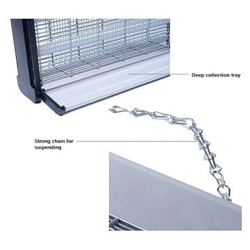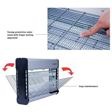Inside there are two fluorescent tubes, which use an optimal wavelength to attract insects, it has a high-voltage metal grid, which kills these insects, and a removable tray at the bottom to collect insects.